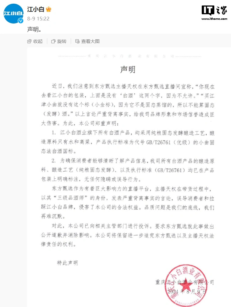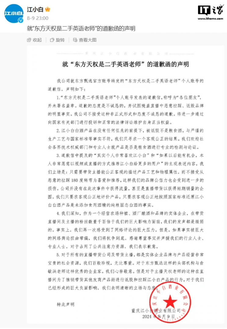 在涉事主播发布道歉函后,江小白酒业 8 月 9 日在回应声明中称,该道歉函存在掩盖事实意图,道歉态度不诚恳,将进一步通过投诉和法律诉讼维护自身权益。
