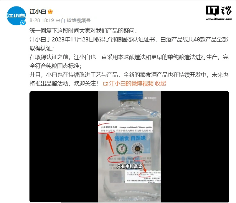 8 月 28 日,江小白官方发布关于对产品质疑的回应: