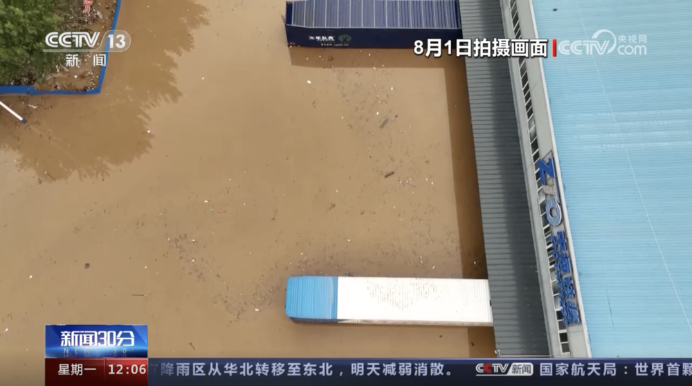 截图自央视新闻视频,显示中通快递京南转运中心被大水所淹。