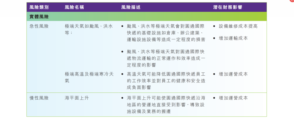 以中通为例,其ESG报告指出:由气候变化造成的实体风险分为急性和慢性两类;急性风险包括强降水和洪水、极热/极寒天气、台风;急性风险造成的影响包括基础设施损坏、运营成本增加、人员健康威胁、营收下降。