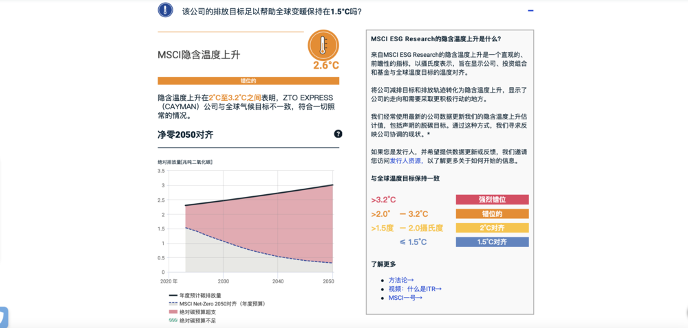 MSCI仅对中通和韵达进行了评价。中通被评为BB级,落后于至少63%的同行;韵达被排在了最差的CCC等级。从碳排放目标看,两家企业的隐含升温,未能满足全球升温控制在1.5摄氏度内的要求,中通更是达到2.6摄氏度。