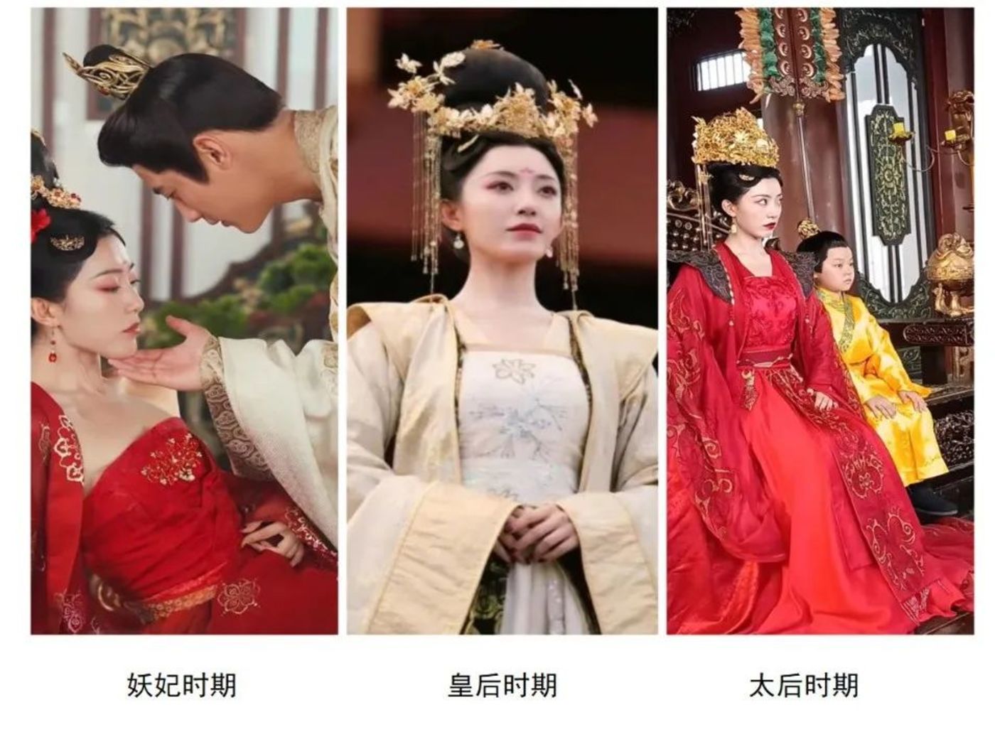 在服化道方面,以近期爆火的《妖妃在上》为例,其服化道在同类型的古装短剧中都可圈可点。女主前期的“妖妃”人设,服装以大红色和若隐若现的露肤妩媚感为主;而到后期逆袭成皇后和太后,服饰以白金和黑红金为主,凸显沉稳和优雅华贵的角色形象。这些并不起眼的服化道,相比于一套“皮肤”拍完整部剧的其他短剧,从侧面提升了整部剧的质感和精品度。