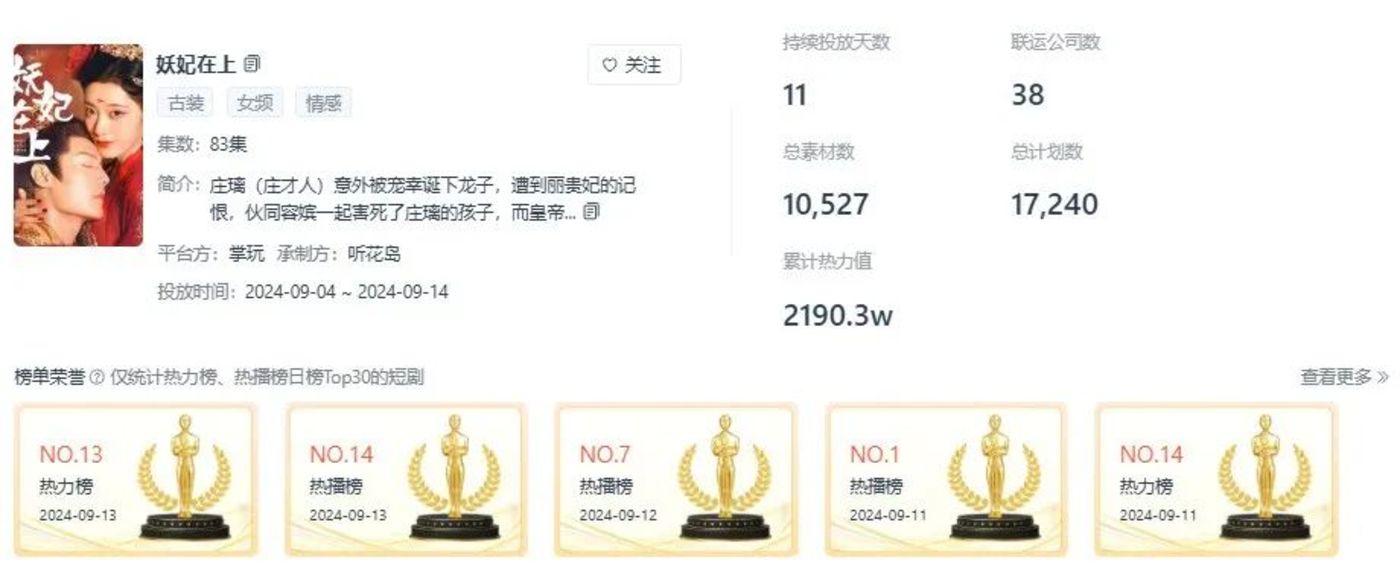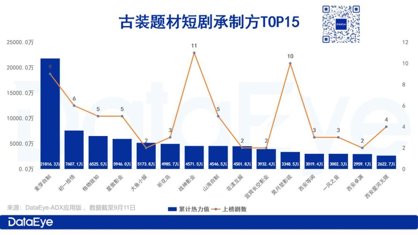 值得注意的是,大鱼小娱仅2部作品,但累计热力值总数超5000W,战神影业承制的古装短剧共有11部,累计热力值超4500W,位列第七。TOP3断崖领先,榜四往后的承制方在古装短剧方面,累计热力值差距较小。