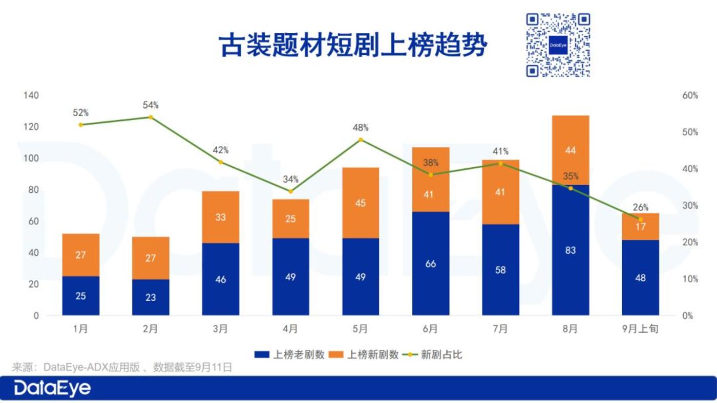 而从上榜趋势来看,9月仅过去10天,但上榜数已达到65部,超过8月的50%,预计本月古装题材短剧数会继续走高,数量有望突破150部。从占比来看,古装短剧的延长效果更佳,新剧占比在40%左右浮动,大多数短剧在上线后的1-2个月内依旧火热在榜。
