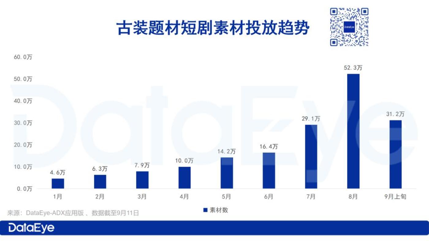 从广告素材投放趋势来看,今年以来古装题材的广告素材逐月上升。就暑期档(7月-9月初)来看,古装题材短剧的广告素材投放数是上半年(1-6月)总和的1.9倍。而9月上旬刚过,古装题材的广告素材投放已经远超6月的素材数,9月上旬10天的古装题材广告素材数超31W组。
