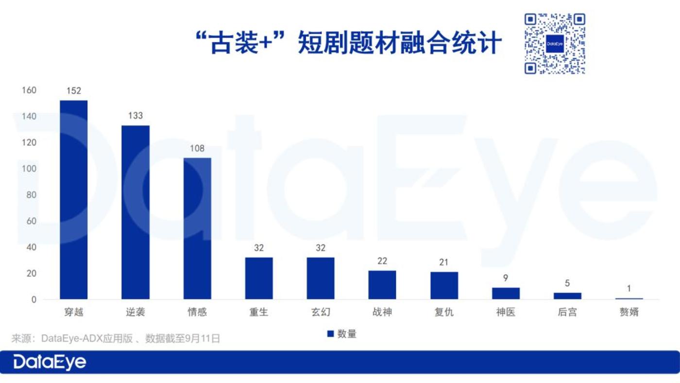 随着短剧创作深入发展,题材融合是必然趋势。王侯将相、后宫争斗的“古装剧时代”似乎已成过去,如今的古装题材更加青睐“小人物的成长”。从题材融合来看,与古装题材短剧结合较多的是穿越、逆袭、情感这三类,最多是穿越,有152部,其次是逆袭题材,有133部。