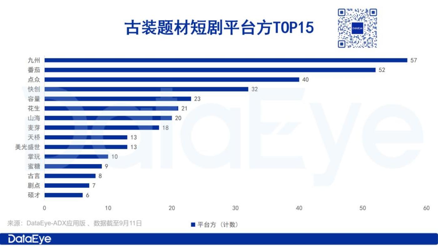 从平台方来看,头部效应明显。今年上线的413部短剧中,九州以其强势的版权优势,位列第一,占57席;其次是番茄,占52席;点众第三,占40席。