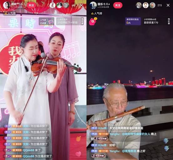 夜幕降临,一轮明月寄托欢聚与丰收的喜悦。在河南夏邑县、湖北武汉等地,@颖颖(唱响老家)、@国乐十八 等主播也带来各具特色的“村晚”直播。@颖颖(唱响老家)邀请了河南当地非遗传承人带来战鼓、豫剧、曲剧等表演。73岁的音乐人@国乐十八 鲍仁伟则来到江滩边,用陶笛、陶埙等乐器演绎传诵千年的诗歌乐曲,呈现江城武汉的文化底蕴和魅力。