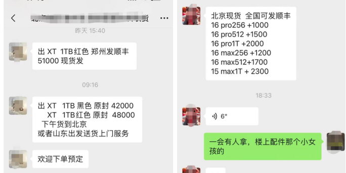 作为资深黄牛,早在9月19日,张奇就给顾客提供低于官网价的iPhone 16,“压价100~200元,9月20日顺丰到付。”同时,9月19日张奇就能给顾客送货上门,“iPhone 16 Pro 256G加价1000,最高的16 Pro 1T加价2000元。”