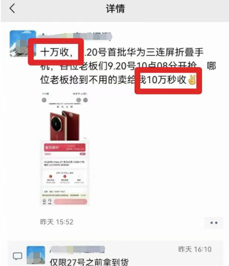 在社交平台上,抢华为三折叠更是被戏称为“空手套1万的机会”,“可以不用,但必须得抢”的新财富密码。