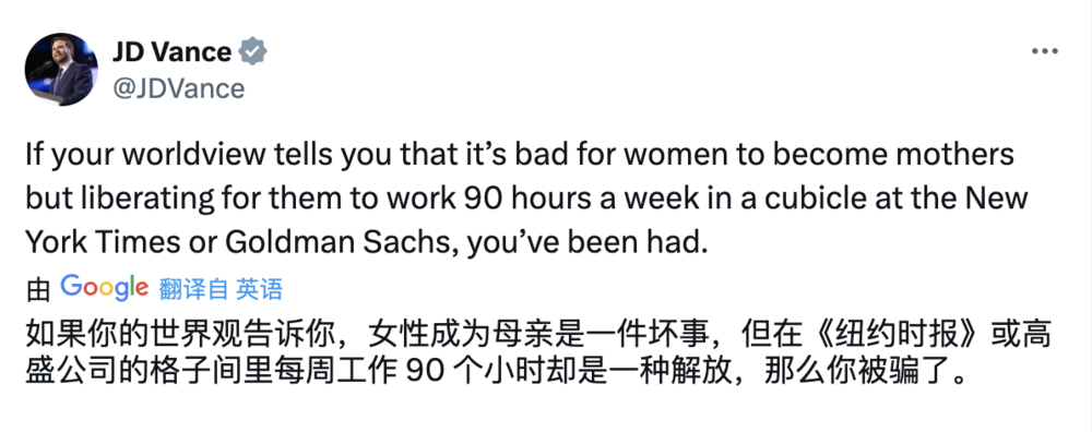 “如果你的世界观告诉你,女性成为母亲是一件坏事,但在《纽约时报》或高盛的格子间里每周工作90个小时却是一种自由解放,那你就被骗了。”