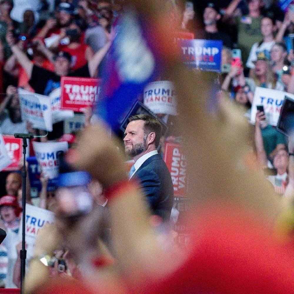 他站在讲台上,身穿与特朗普相同的深蓝色西装,打着相同的红色领带,拉满火力攻击拜登,攻击哈里斯,攻击把美国的工作机会送给中国,把美国军队送到乌克兰的自由派精英;攻击那些让通货膨胀破坏经济,那些让移民涌入祖国母亲腹地的民主党人。
