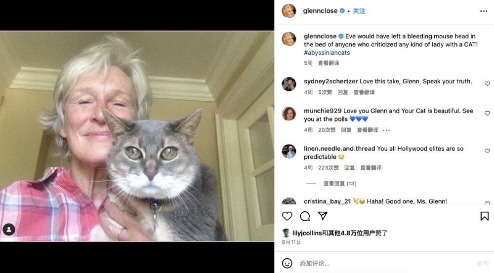 更戏剧化的,是饰演万斯外婆的演员格伦·克洛斯,如今也讽刺万斯的“猫女言论”。老太太在自己的ins上发布了一张抱着猫的照片,并配文:“如果有人批评养猫的女士,夏娃就会在他的床上留下一个流血的老鼠头!”