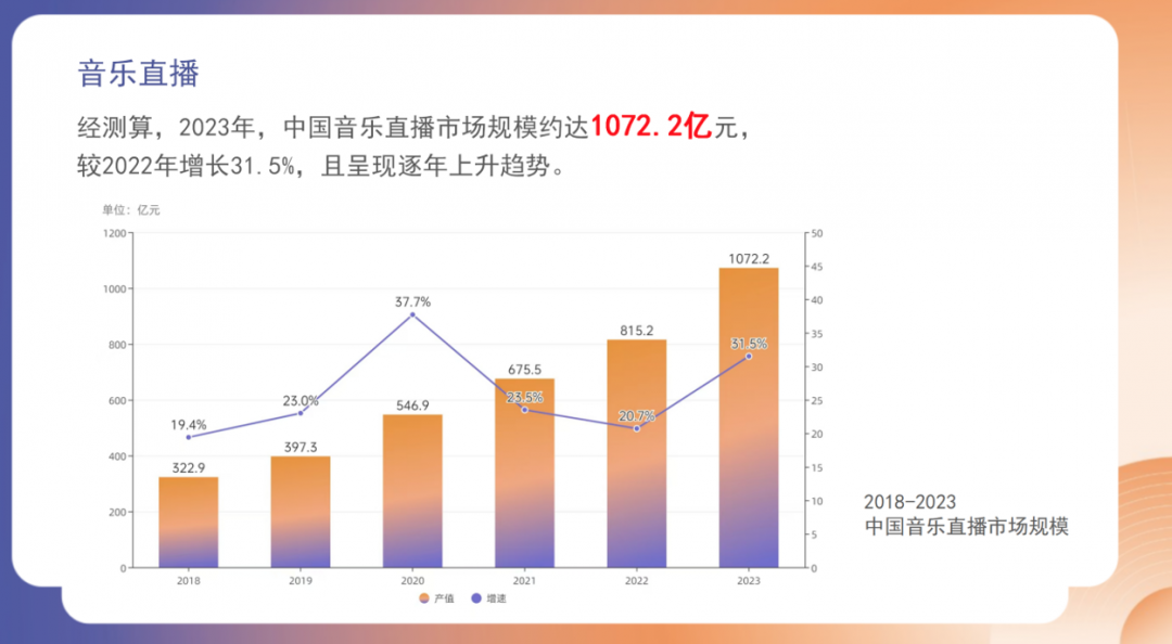 2023年我国音乐直播市场规模为1072.2亿元,较2022年增长31.5%,且呈现逐年上升趋势。报告显示,在整体数字音乐市场中,音乐直播市场的规模占比相对较大,成为推动数字音乐市场增长的重要力量。
