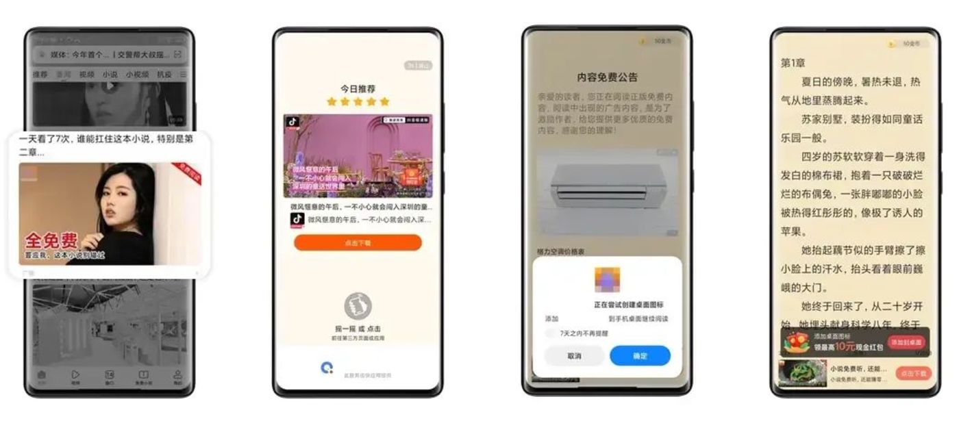 从投放行业来看,主要是小说阅读、微短剧、工具在投。这主要因为快应用比较适配下沉市场,特别是中高龄用户,他们对广告的免疫不强,同时快应用在手机上出现的场景较为自然、原生。