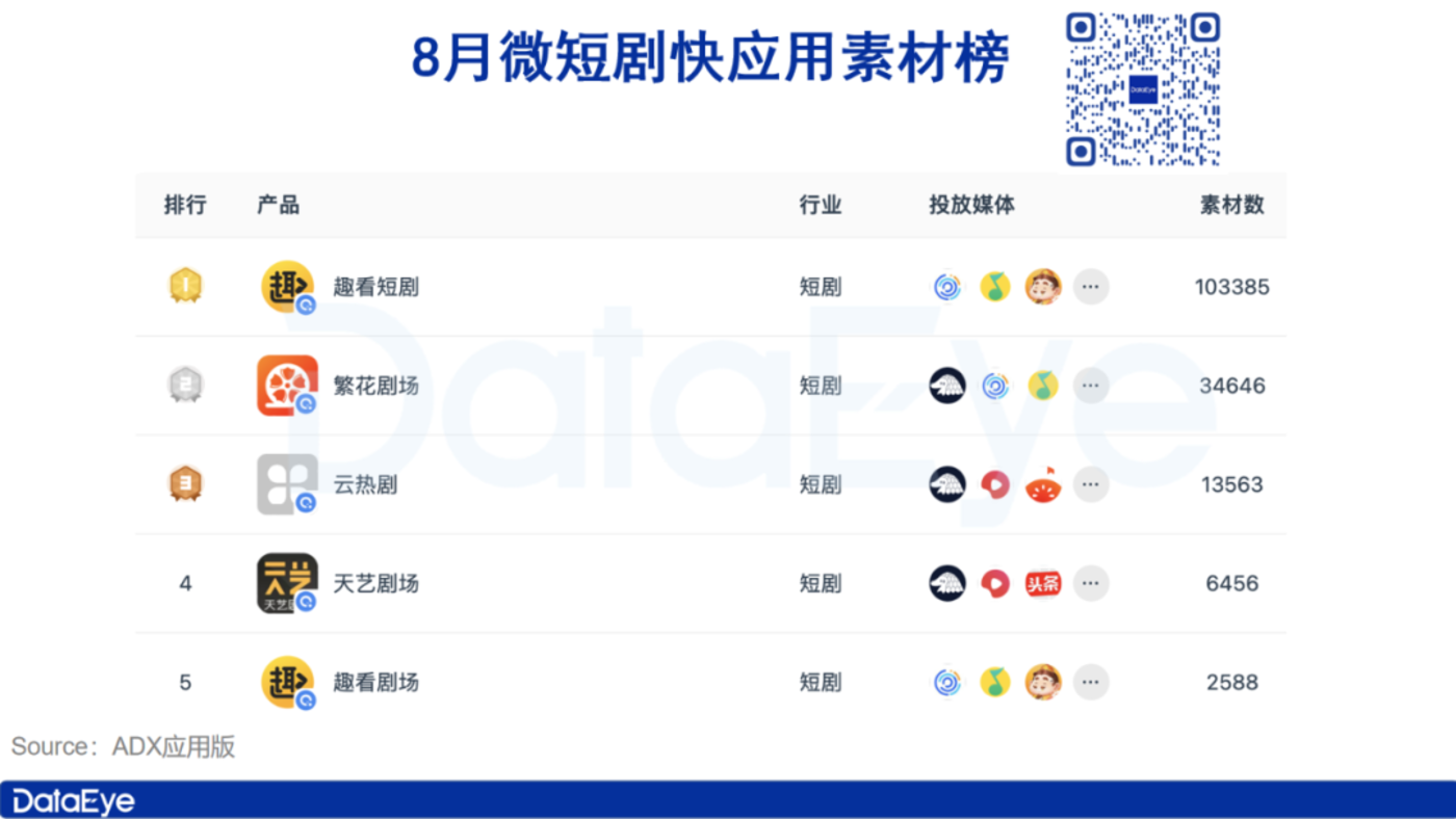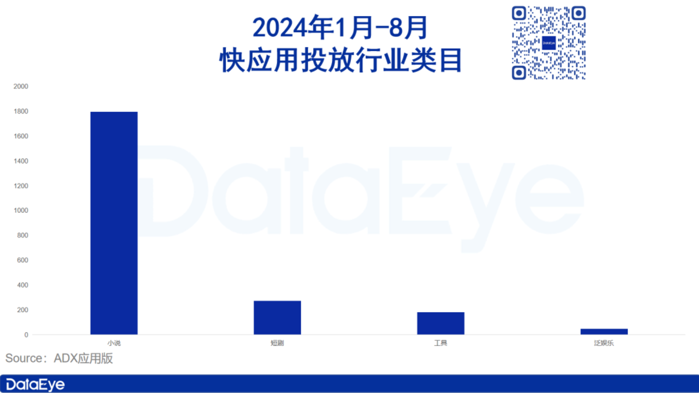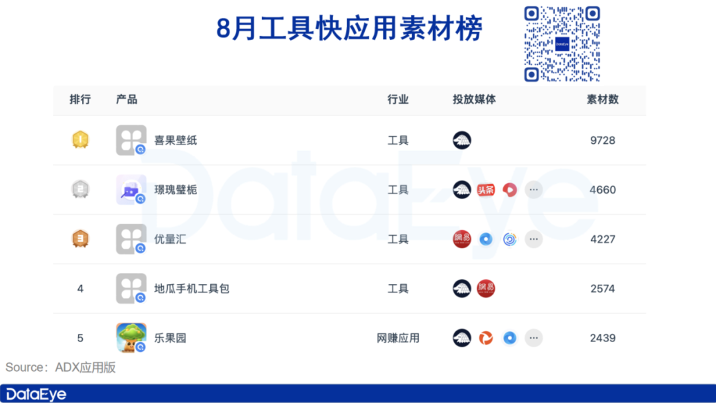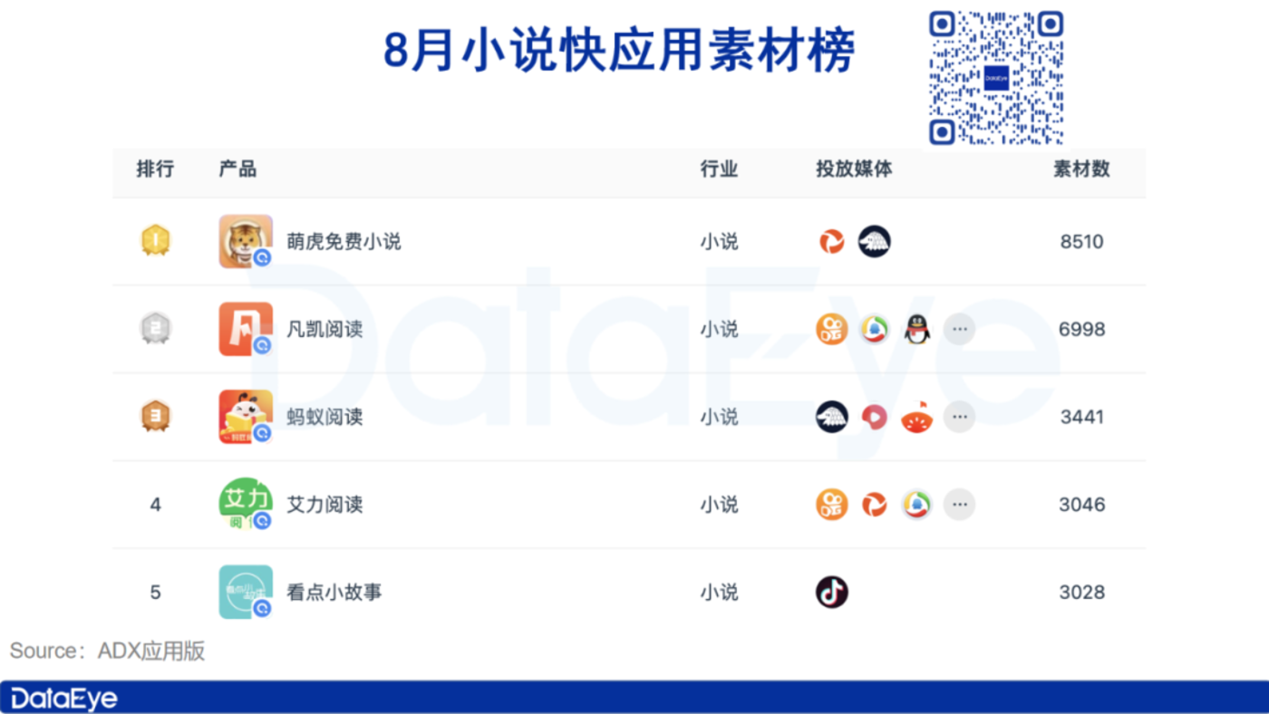 具体到8月,以下是ADX应用版上,微短剧、小说阅读、工具的快应用素材榜: