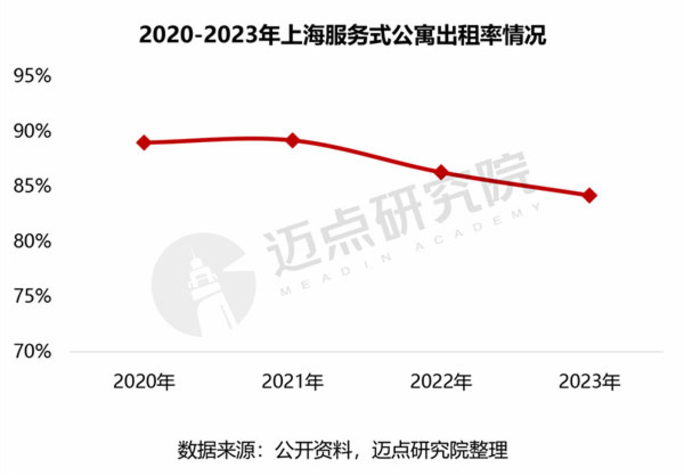 以外企众多、金融业发达的上海为例。根据迈点研究院数据显示,上海服务式公寓的出租率呈逐年下降态势,由2020年的89%降至2023年的84%。迈点研究院指出,就当前的就业环境来看,未来服务式公寓的出租率仍面临严峻形势。