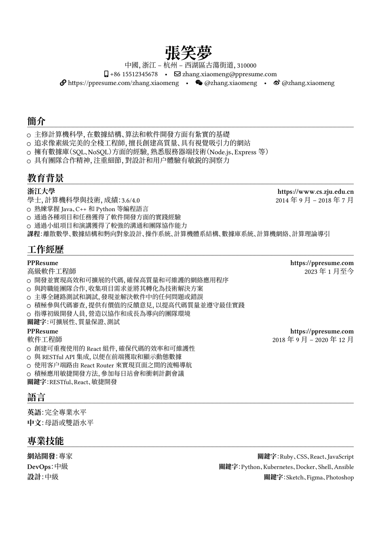 与市面上大多数的简历排版服务不同,PPResume 采用 LaTeX 作为基础的排版引擎,因此生成的 PDF 有着极佳的质量和观感,附上生成的英文、简历中文和繁体中文简历样章:
