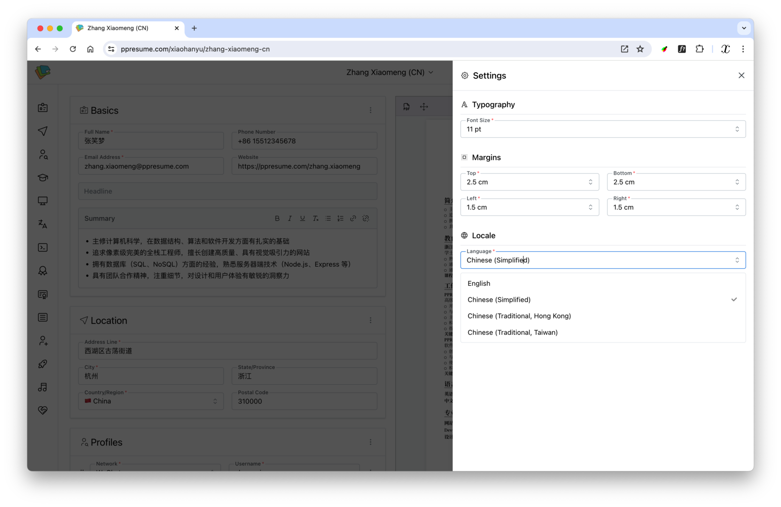PPResume 应该也是市面上唯一一款支持多语言混合排版并遵循最佳排版实践的简历生成器,目前支持英文和中文(包括简体中文、繁体中文香港和繁体中文台湾),blog:https://blog.ppresume.com/posts/multi-languagues-support。