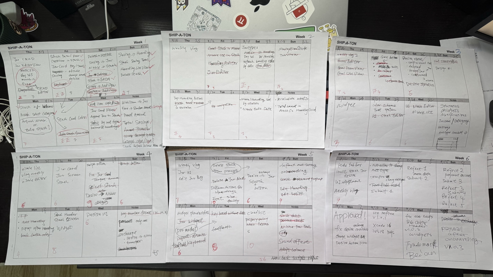 过去的六个星期里,我打印了六张周计划,每天把开发计划和番茄钟个数都记在上面。最终我终于写满了六页,作为这个过程的一个记录和见证。