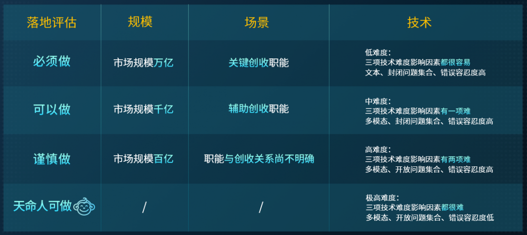 在林凡看来,现阶段AI无法马上帮助公司节省一半人力成本、帮助业务快速提升100%搞个大事实现颠覆式创新。想要评估AI在企业内落地应用的前景,需要根据“规模、场景、技术”三个原则来衡量。“规模”是指企业希望用AI提效的具体业务的收入体量。“场景”方面,主要是AI落地后,业务创收或降本的变化量有多少。“技术”方面,则需要拆解所需的AI技术实现难度,如技术应用属于单轮交互还是多轮交互,“文科”还是“理科” ,文本还是多模态。