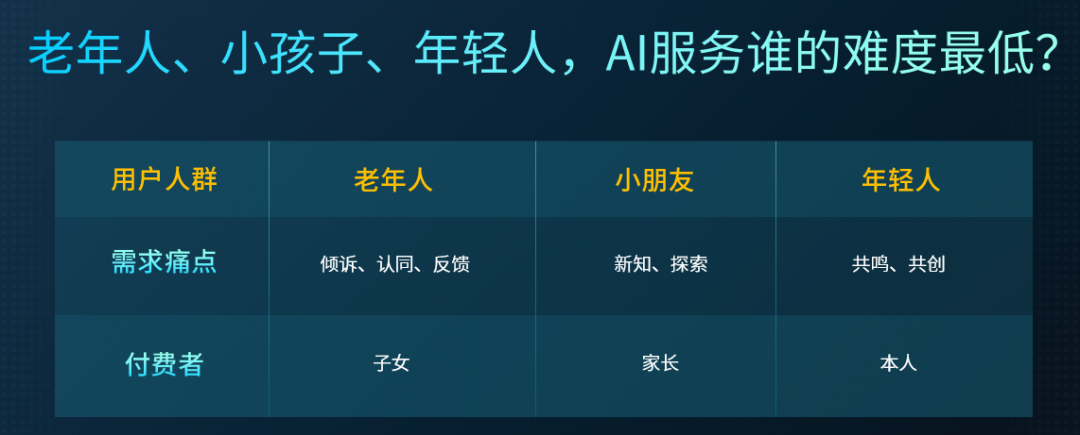 在谈及AI对社会中不同用户产生的影响时,林凡坦言,通过落地AI来服务老年群体,在技术难度上是低于服务儿童和年轻人的。AI与老人对话过程中的角色就像是“捧哏”,但与小孩对话则需要给他带来大量信息输入。而AI与年轻人的对话,则需要扮演“Soul mate”的角色,需要真正与其产生心灵共鸣,难度是极高的。