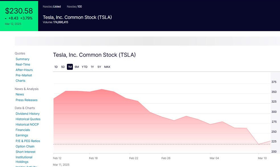 【犇驰财经】3月12日消息,据外媒报道,当地时间周一,美股上演“黑色星期一”,三大股指均明显下跌,苹果、微软、谷歌母公司Alphabet、英伟达、亚马逊等科技巨头无一幸免,马斯克担任CEO的特斯拉更是大跌40.52美元,收盘报222.15美元,跌幅为15.43%,创下自2020年9月以来的最大跌幅,市值缩水至7145.49亿美元,较上周五蒸发1303.7亿美元,折合人民币约9459.73亿元。