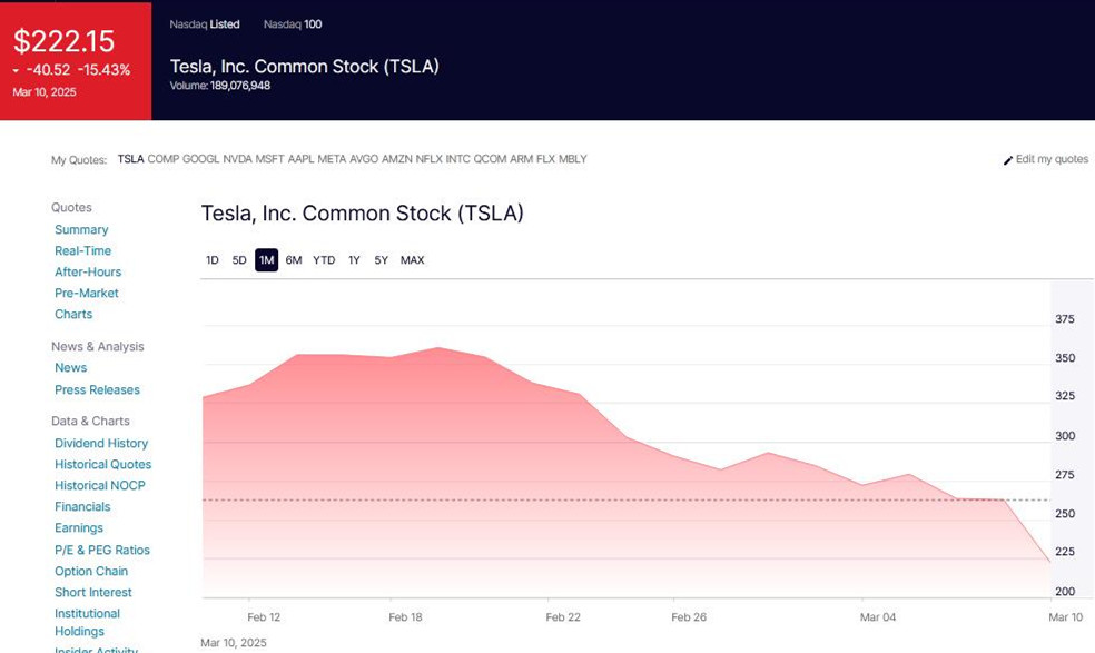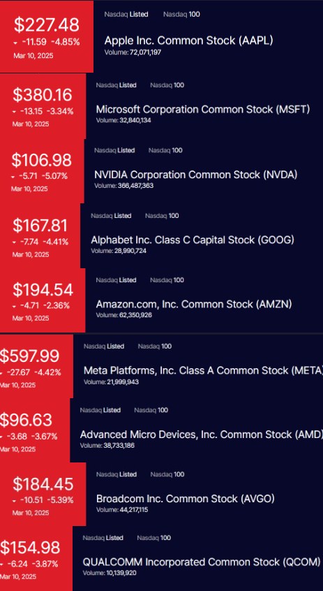 【犇驰财经】3月11日消息,据外媒报道,当地时间周一,美股上演“黑色星期一”,三大股指均明显下跌,琼斯工业平均指数报收41,911.71点,下跌890.01点;纳斯达克综合指数报收17,468.32点,大跌727.9点;标普500指数报收5,614.56点,下跌155.66点。