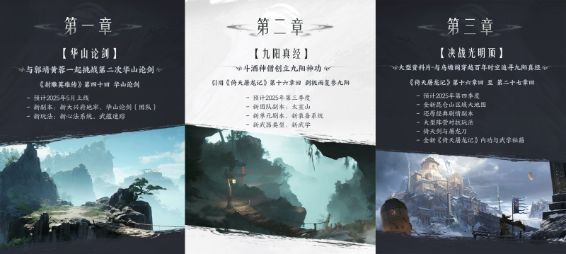 2.0版本为了增加“金庸感”,提升武侠江湖沉浸感,美术方面也经历大量重做,包含玩家角色、NPC、场景氛围、武学动作、特效等。未来《射雕》新章回都将大有乐趣:从地图、副本、玩法、到新的故事,或是全服少侠并肩作战的大型剧本活动。华山论剑的巅峰对决,九阳真经的离奇曲折,决战光明顶的荡气回肠……以原著为尺,力求用游戏的方式还原金庸世界。静待穿越时空裂隙,一起开启新篇章。