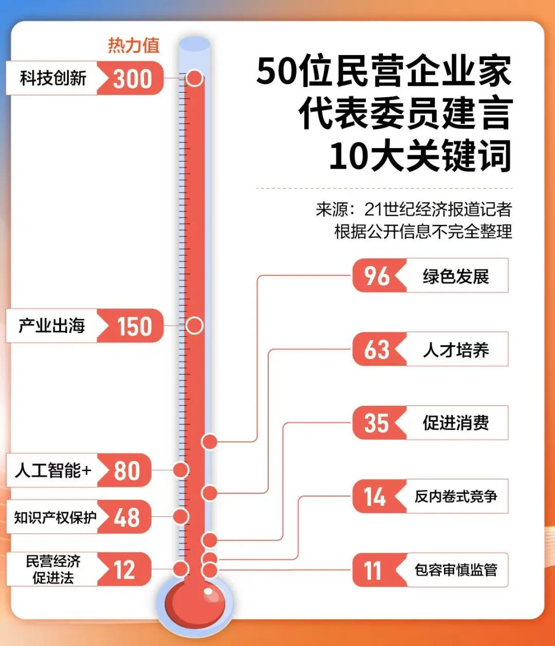 21世纪经济报道梳理了50位民营企业家代表委员在今年全国两会上提交的建议、提案,发现“科技创新”“产业出海”和“人工智能+”是出现最多的关键词。