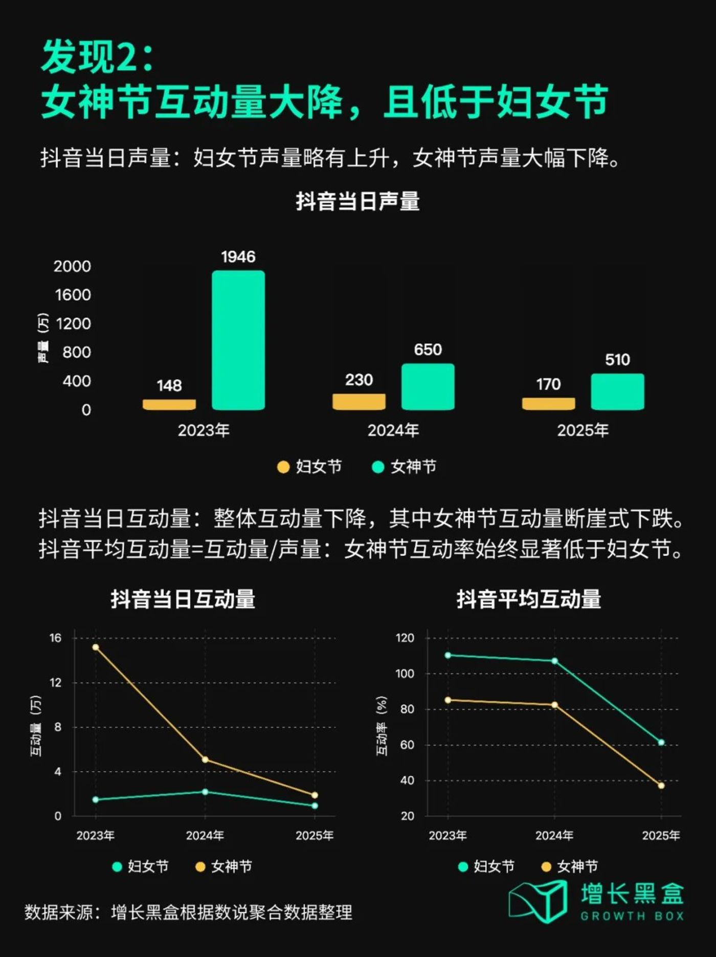 其次,有关抖音的数据显示,虽然“女神节”和“妇女节”的互动量都在下降,但“女神节”的互动量可谓是断崖式下跌。
