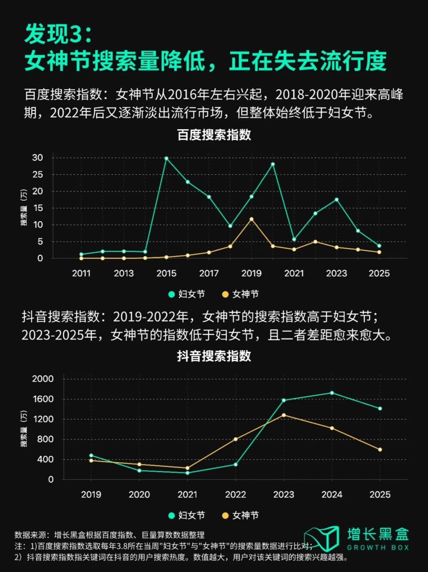 我们对比了“妇女节”和“女神节”两个关键词在主流社媒平台的表现,将数据端传递出的信号总结为3个方面: