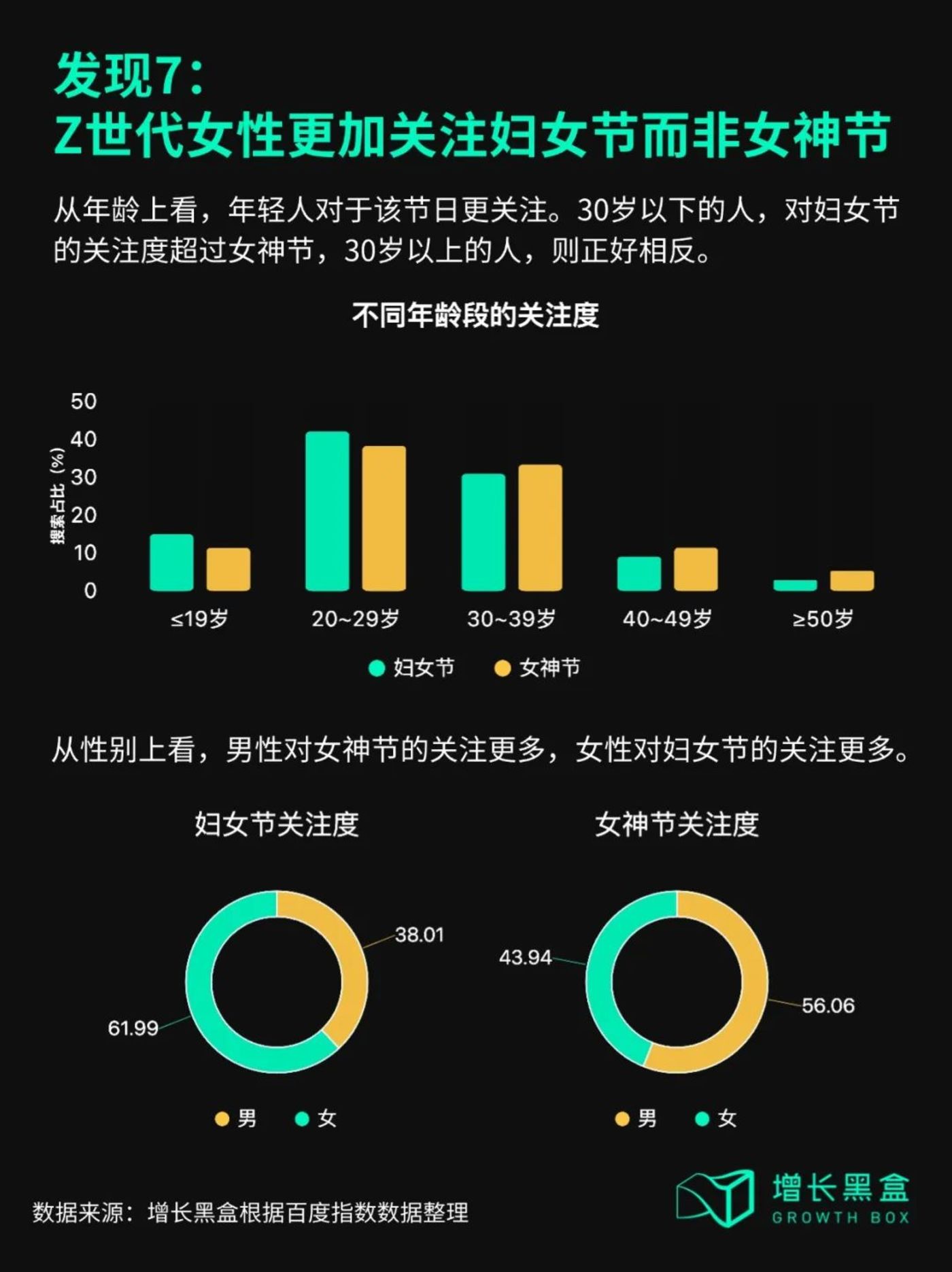 百度指数显示,30岁以下的人,对“妇女节”的关注度超过“女神节”,而30岁以上的人则正好相反。男性更关注“女神节”,女性则更关注“妇女节”。这对于拥有明确客群画像的品牌来说,是值得注意的营销关键点。