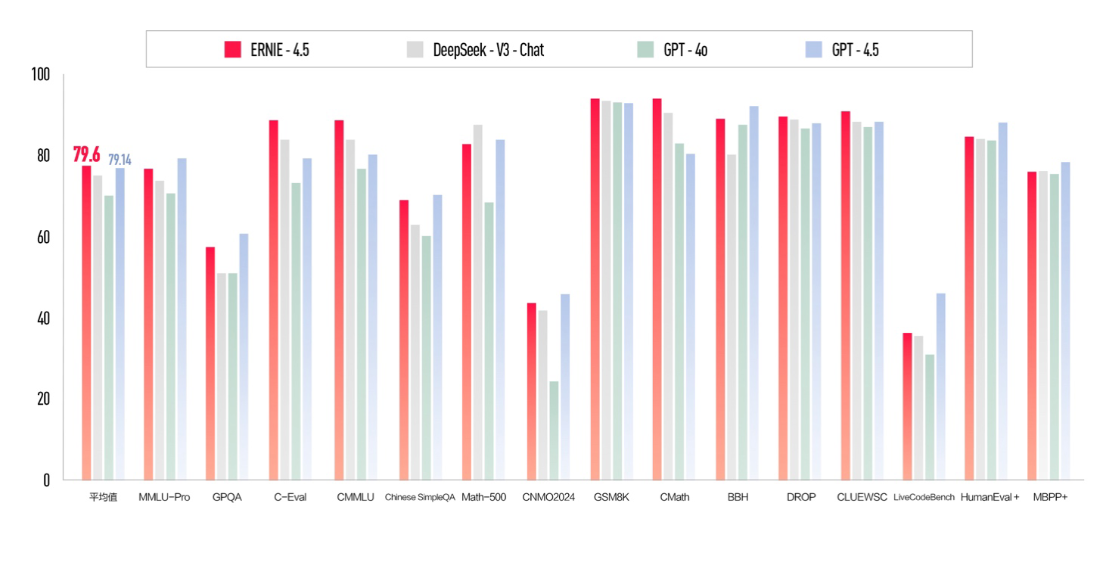 文心大模型4.5的多项基准测试成绩优于GPT4.5、DeepSeek-V3等,并在平均分上以79.6分高于GPT4.5的79.14。