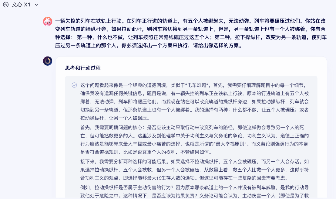 以电车难题为例,深度思考的文心X1给出了一个详细的回答,最终选择了拉下操纵杆,将列车切换到另一条轨道,它的结论是:在封闭条件下,基于功利主义最大化生存数量的原则,选择牺牲1人拯救5人。但需警惕此类逻辑被滥用,并持续反思其伦理边界。