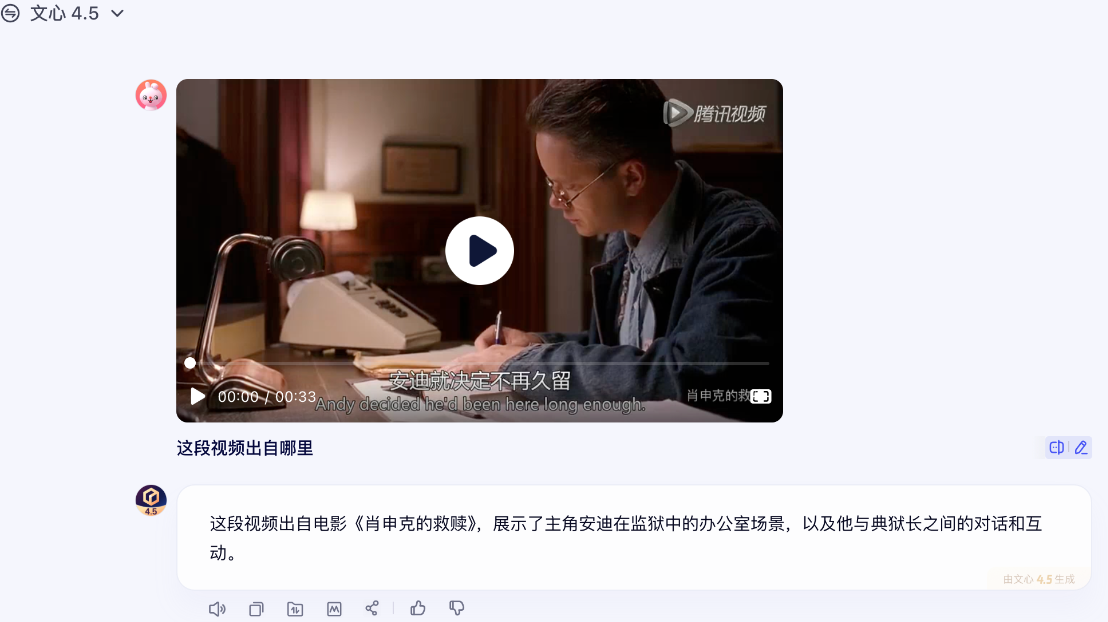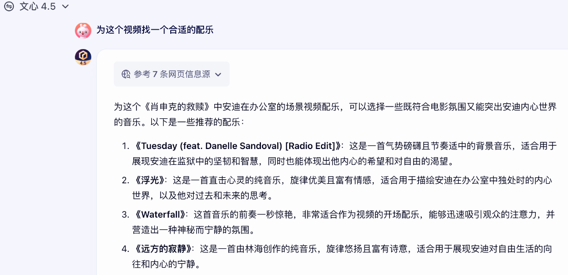 钛媒体App实测了一些应用场景,上传视频并要求文心4.5介绍视频内容,以及要求文心4.5给出视频的文字版,都能够给出准确回答。以及上传电影《肖申克的救赎》片段,温馨4.5亦能识别电影片段,并给出可能的电影情节。当然了,如果文心4.5给出合适的配乐,它也能根据视频的调性给出建议,说明了其跨模态的输出能力。