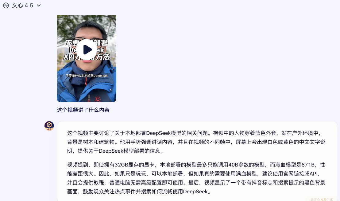 文心4.5的能力也可以从图片和视频理解,、图片生成、RAG测试、逻辑测试、文本创作等方面体现。文心4.5支持上传文档、图片、音频和视频文件,兼容常见的格式,目前在文件大小上有所限制,例如单个视频文件大小不超过20M,可能与效率和成本有关。